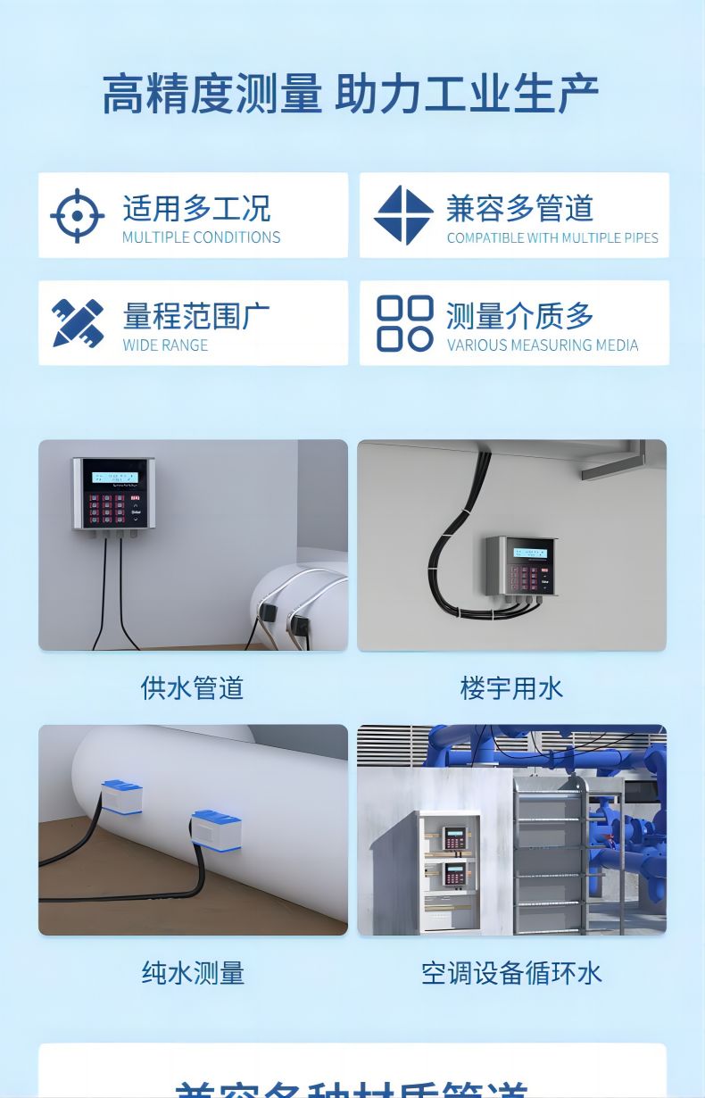 產(chǎn)品描述:聯(lián)測(cè)超聲波流量計(jì)適合相對(duì)純凈液體流量的管外測(cè)量,尤其是在水流量測(cè)量、在工業(yè)循環(huán)水、空調(diào)制冷循環(huán)水、原水、高壓水、自來(lái)水,污水排放管等廣泛應(yīng)用。