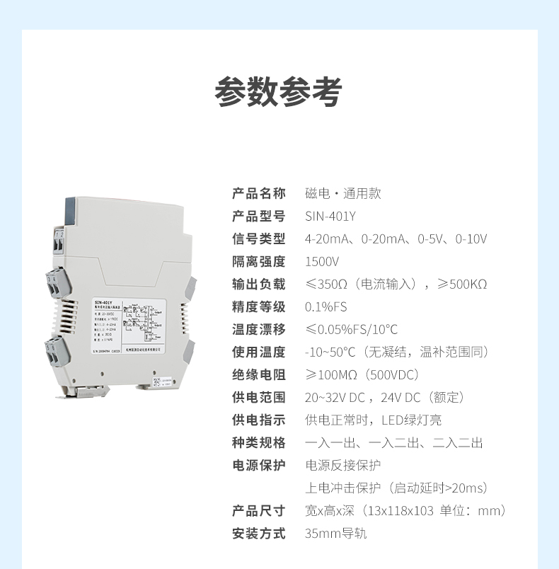 產品描述:信號隔離器是一種信號隔離裝置,將輸入單路或雙路電流或電壓信號,變送輸出隔離的單路或雙路線性的電流或電壓信號,并提高輸入、輸出、電源之間的電氣隔離性能。