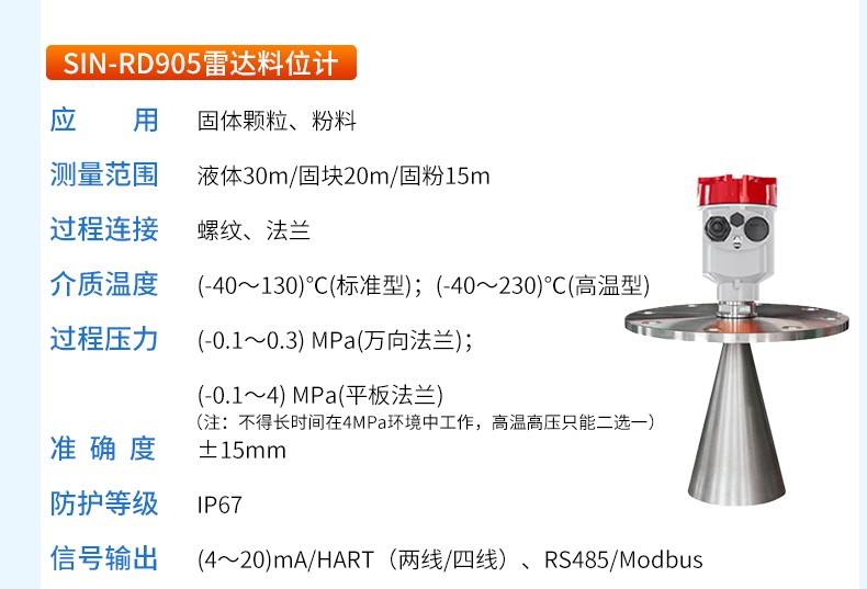 產(chǎn)品名稱:SIN-RD905雷達(dá)料位計(jì)_適用于固體顆粒、粉料