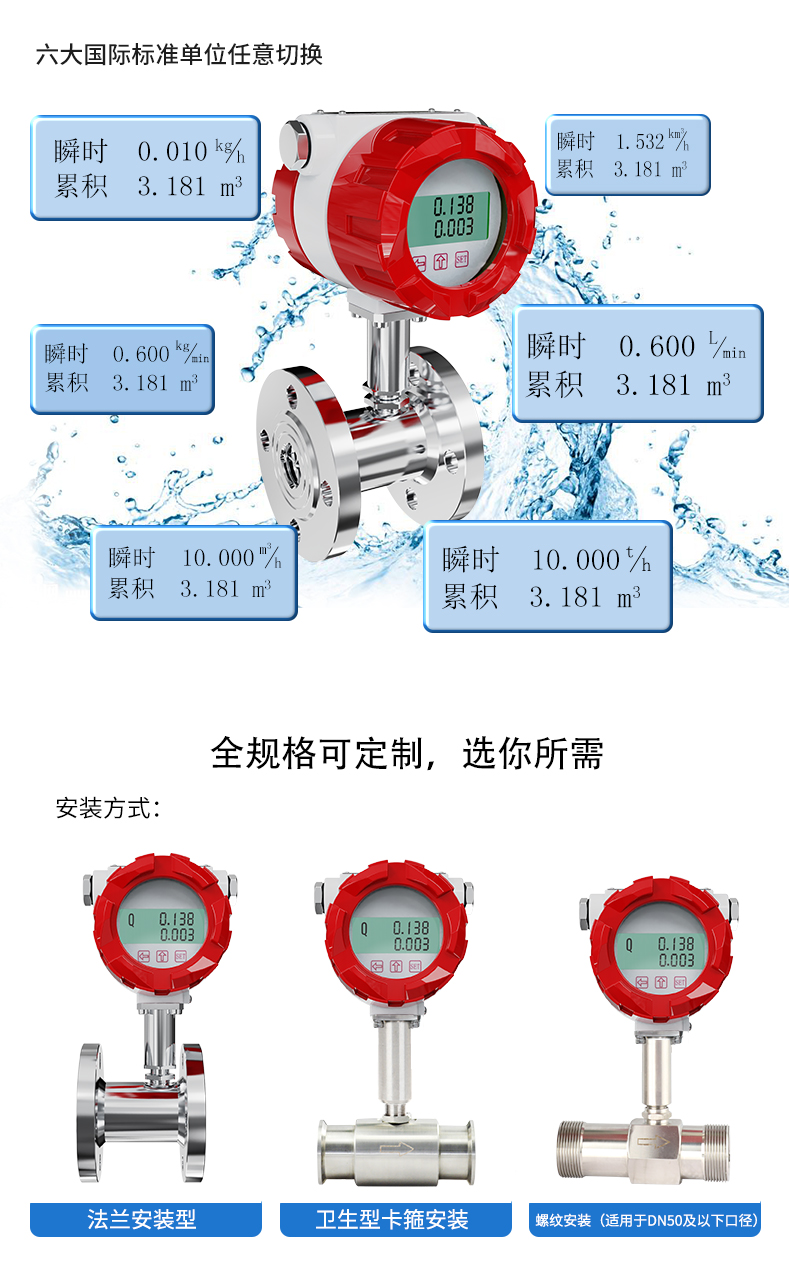 產(chǎn)品描述:液體渦輪流量計基于力矩平衡原理,屬于速度式流量儀表。它具有準(zhǔn)確度高、重復(fù)性好、結(jié)構(gòu)簡單、壓力損失小、維修方便等優(yōu)點,于測量封閉管道中低粘度液體的體積流量。在石油、化工、冶金、供水、造紙等行業(yè)中具有廣泛的應(yīng)用。