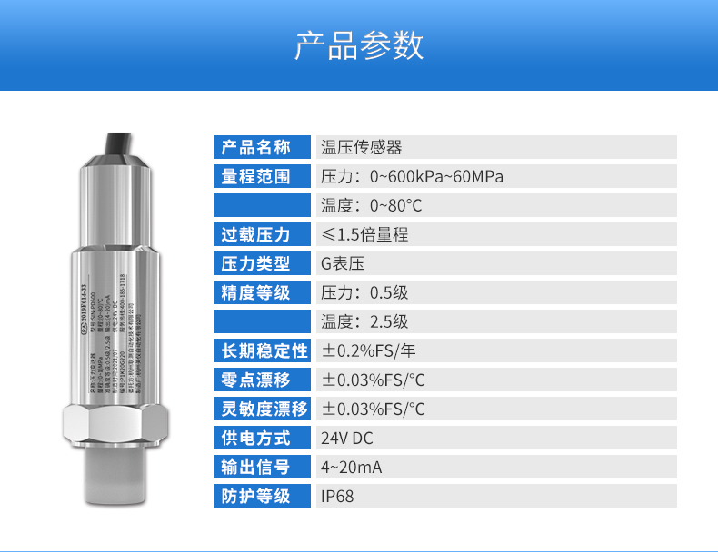 產(chǎn)品描述:溫壓一體變送器是集壓力、溫度一體測量的變送器。 選用高可靠硅壓阻壓力傳感器、熱電阻等作為核心元件, 經(jīng)過溫度補償、數(shù)字電路修正和信號調(diào)理,輸出標(biāo)準(zhǔn)的 工業(yè)信號。產(chǎn)品都經(jīng)過精心設(shè)計、元器件篩選、工藝驗 證固化、循環(huán)加載老煉、環(huán)境模擬測試等過程,保障每 只產(chǎn)品穩(wěn)定可靠。 溫壓一體變送器以其優(yōu)良的準(zhǔn)確度和可靠性,廣泛 應(yīng)用于各類壓力測量。尤其在煤礦、油田、化工、環(huán)保、 醫(yī)藥、水務(wù)等行業(yè)。