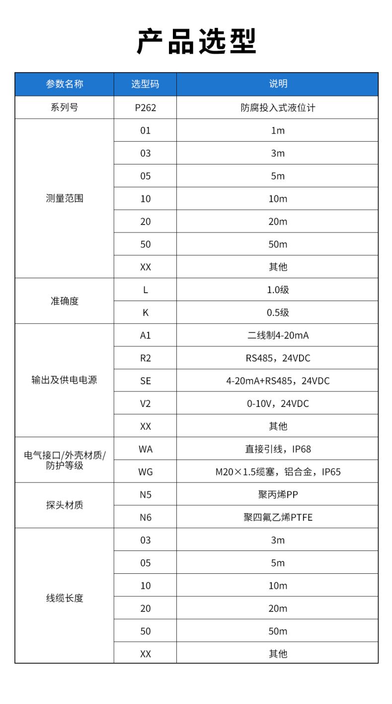 產品名稱:聯測_P262/P262-B防腐投入式液位計/水位計_陶瓷芯體_