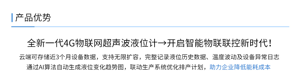 產(chǎn)品描述:WSU-200 4G物聯(lián)超聲波液位計(jì)具有高可靠性、高性價比、易安裝維護(hù)的液位/物位測量儀器,可廣泛用于各種液體和固體物料高度的測量。本產(chǎn)品可選配 NB-IoT 無線通訊功能,用戶可在儀表云平臺進(jìn)行數(shù)據(jù)查看和遠(yuǎn)程監(jiān)控。常見的應(yīng)用工況,如市政、化工、儲運(yùn)等工業(yè)環(huán)境中的河流、水池、儲罐等液位測量。咨詢熱線:400-185-1718